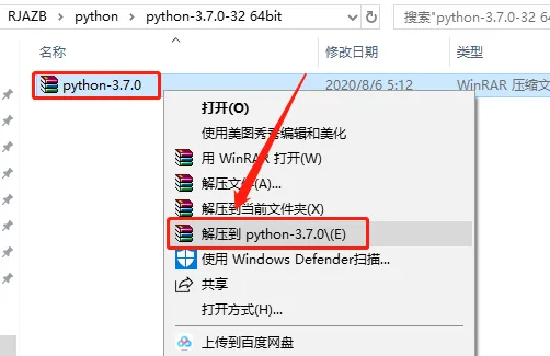 1.打开下载好的软件安装包,鼠标右击【python-3.7.0】压缩包,选择【解压到python-3.7.0】。