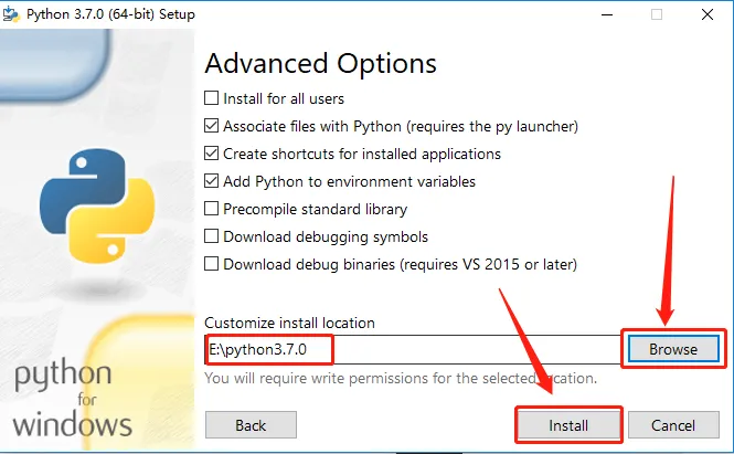 7.点击【browse】设置软件的安装路径,建议在E盘或其他磁盘新建一个【Python3.7.0】文件夹,设置好安装路径后点击【Install】。