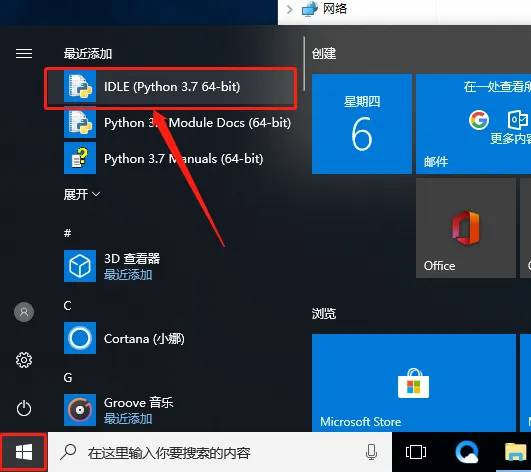 10.在开始菜单栏找到并打开【IDLE (Python 3.7 64-bit)】。