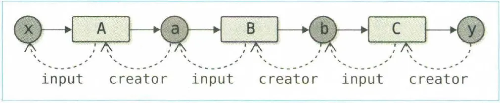 图7-3 从y出发反向遍历计算图这种在数据流动的同时动态建立连接的方式,就是Define-by-Run的精髓。