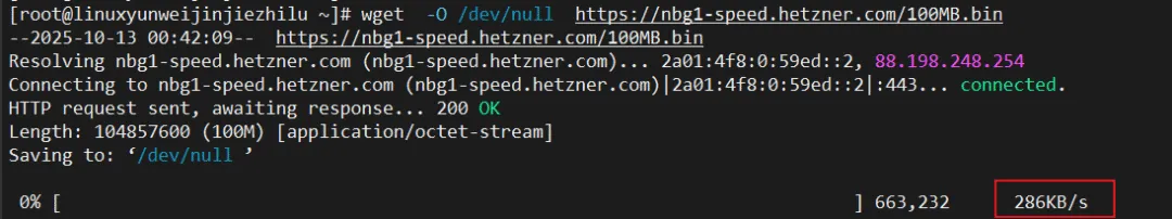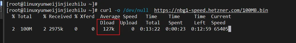 # 使用curl测速curl -o /dev/null https://nbg1-speed.hetzner.com/100MB.bin# 使用wget测速wget -O /dev/null https://nbg1-speed.hetzner.com/100MB.bin
