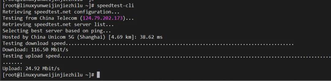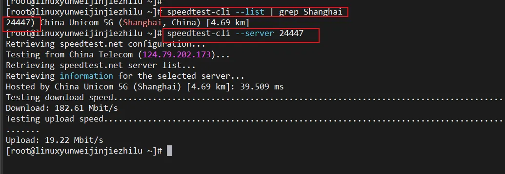# 一键测速speedtest-cli# 只显示简洁结果speedtest-cli --simple# 指定服务器测速speedtest-cli --list | grep Shanghai # 先查找服务器IDspeedtest-cli --server 服务器ID