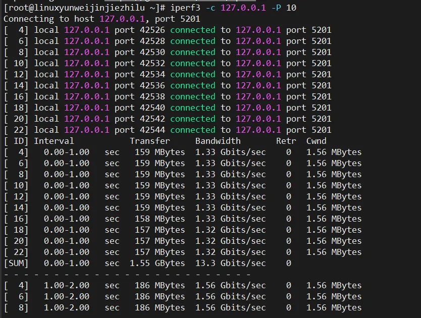 # 基础测试iperf3 -c 服务器IP# 测试30秒iperf3 -c 服务器IP -t 30# 反向测试(测上传速度)iperf3 -c 服务器IP -R# 并发10个连接测试iperf3 -c 服务器IP -P 10