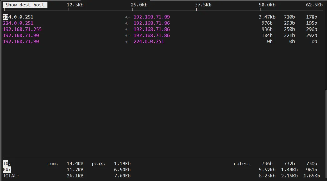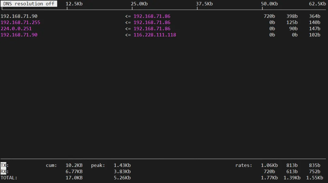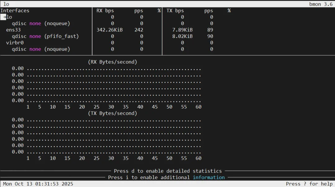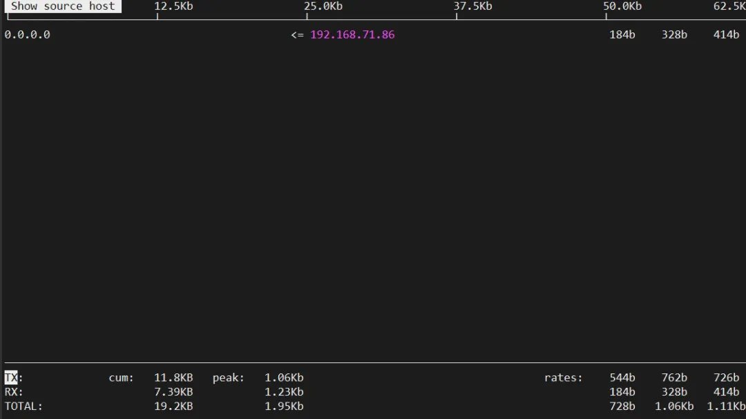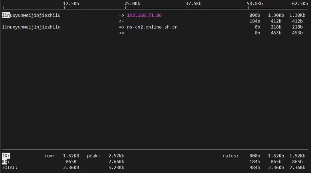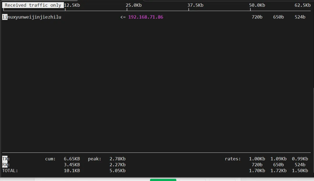 界面会用ASCII图表实时显示上传下载曲线,非常适合长时间观察网络趋势。
