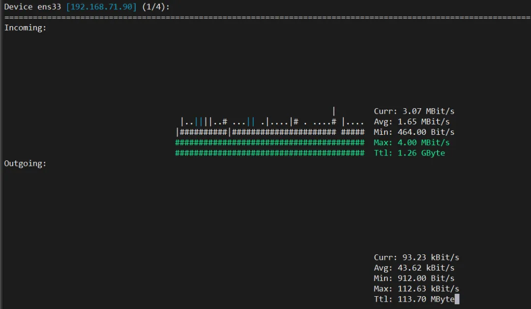 # 监控所有网卡nload# 监控指定网卡nload ens33# 设置刷新间隔为1秒nload -t 1000
