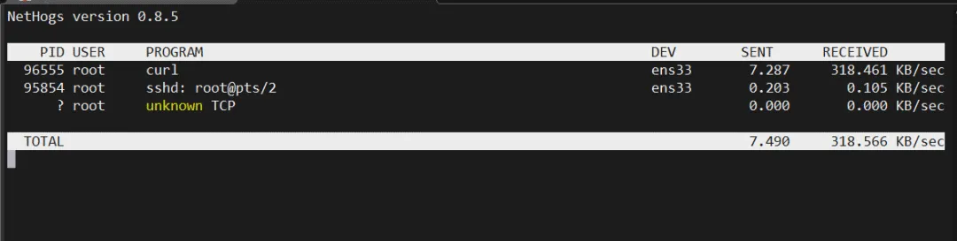 想揪出哪个程序在偷偷跑流量?nethogs按进程显示带宽占用。
