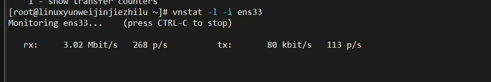 # 安装并启动sudo yum install vnstatsudo systemctl start vnstat# 查看今日流量vnstat -d# 查看本月流量vnstat -m# 查看实时速度vnstat -l