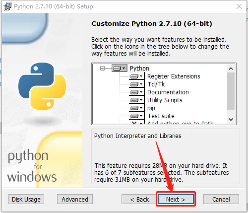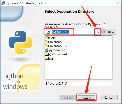 6.点击下拉按钮设置软件的安装路径,建议在D盘或其他磁盘新建一个【Python2。7.1】文件夹,设置好安装路径后点击【Next】。
