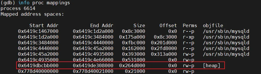 dump memory mysqlpass 0x6419dbcbb000 0x6419de308000