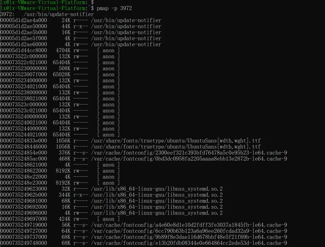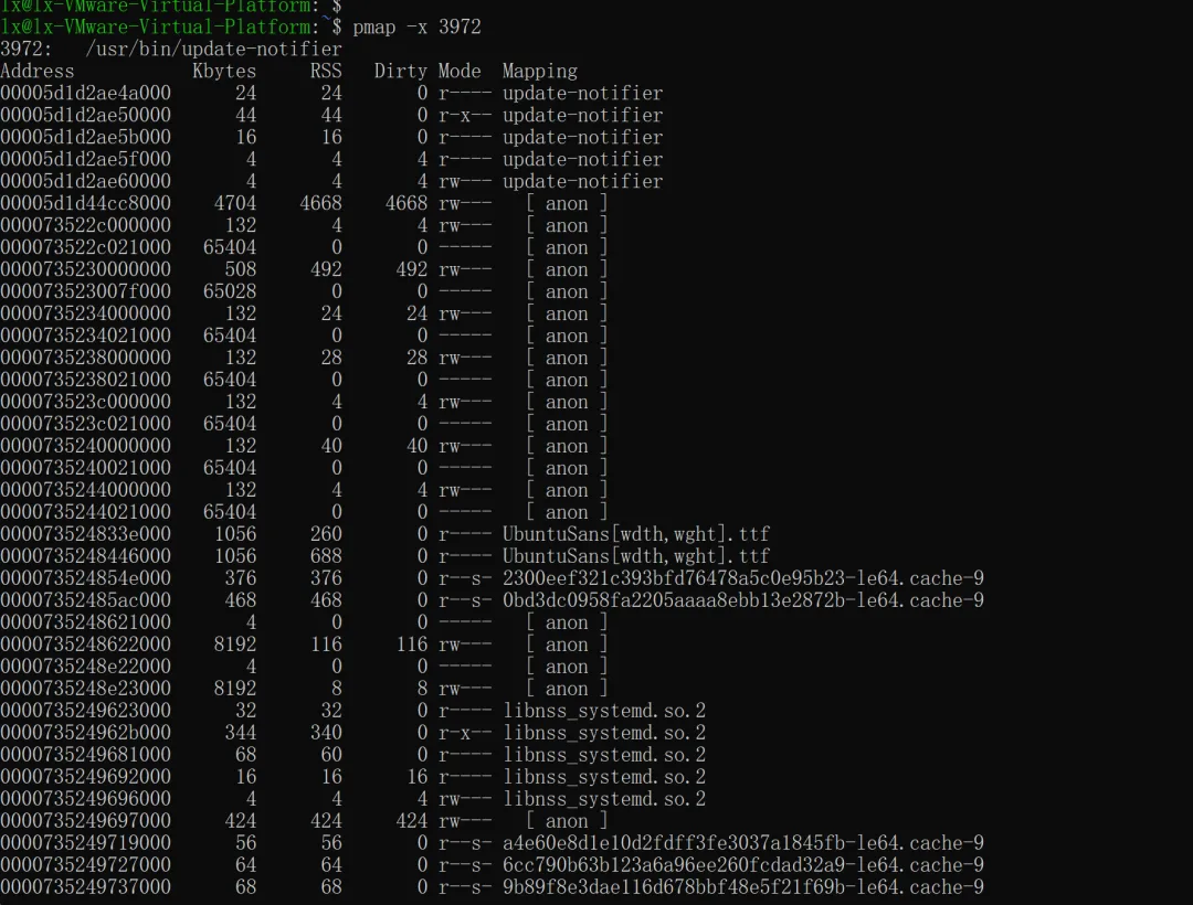 如果不加任何选项,默认显示简洁格式,每行包含:起始地址、映射大小(Kbytes)、权限、映射名称。