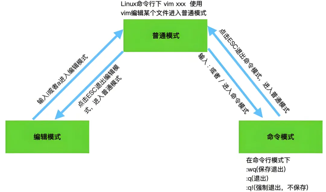 普通模式(Normal Mode):启动VI后的默认模式。此时键盘输入不是输入文字,而是执行命令(如移动光标、复制、删除、搜索)。按 Esc键可随时从其他模式返回此模式。