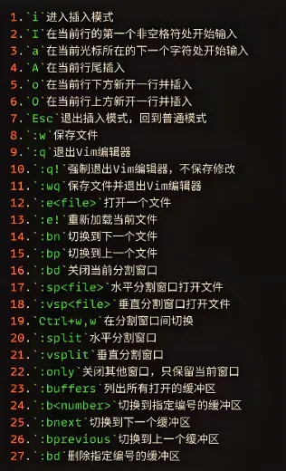 命令行模式(Command-line Mode):在普通模式下按 :进入。可执行保存、退出、搜索替换、设置等复杂命令。