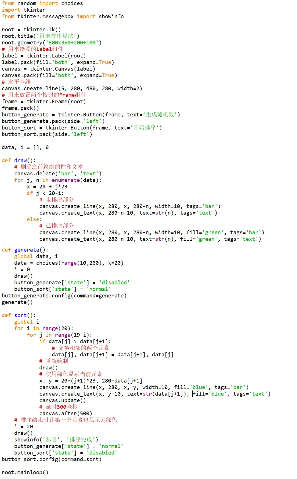 编写Python程序,使用tkinter设计界面,创建Label组件和Canvas画布模拟冒泡算法原理与排序过程。