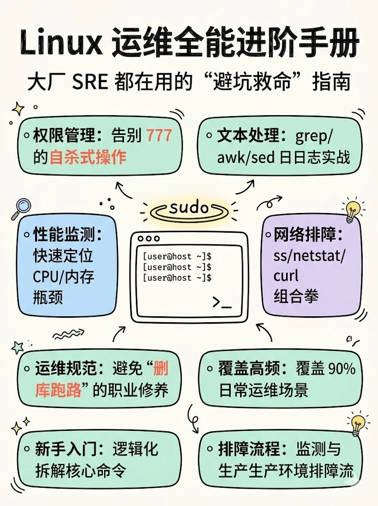 Linux是运维工程师的核心战场,90%的服务器跑的都是Linux。下面从运维角度,梳理Linux必须掌握的知识体系。