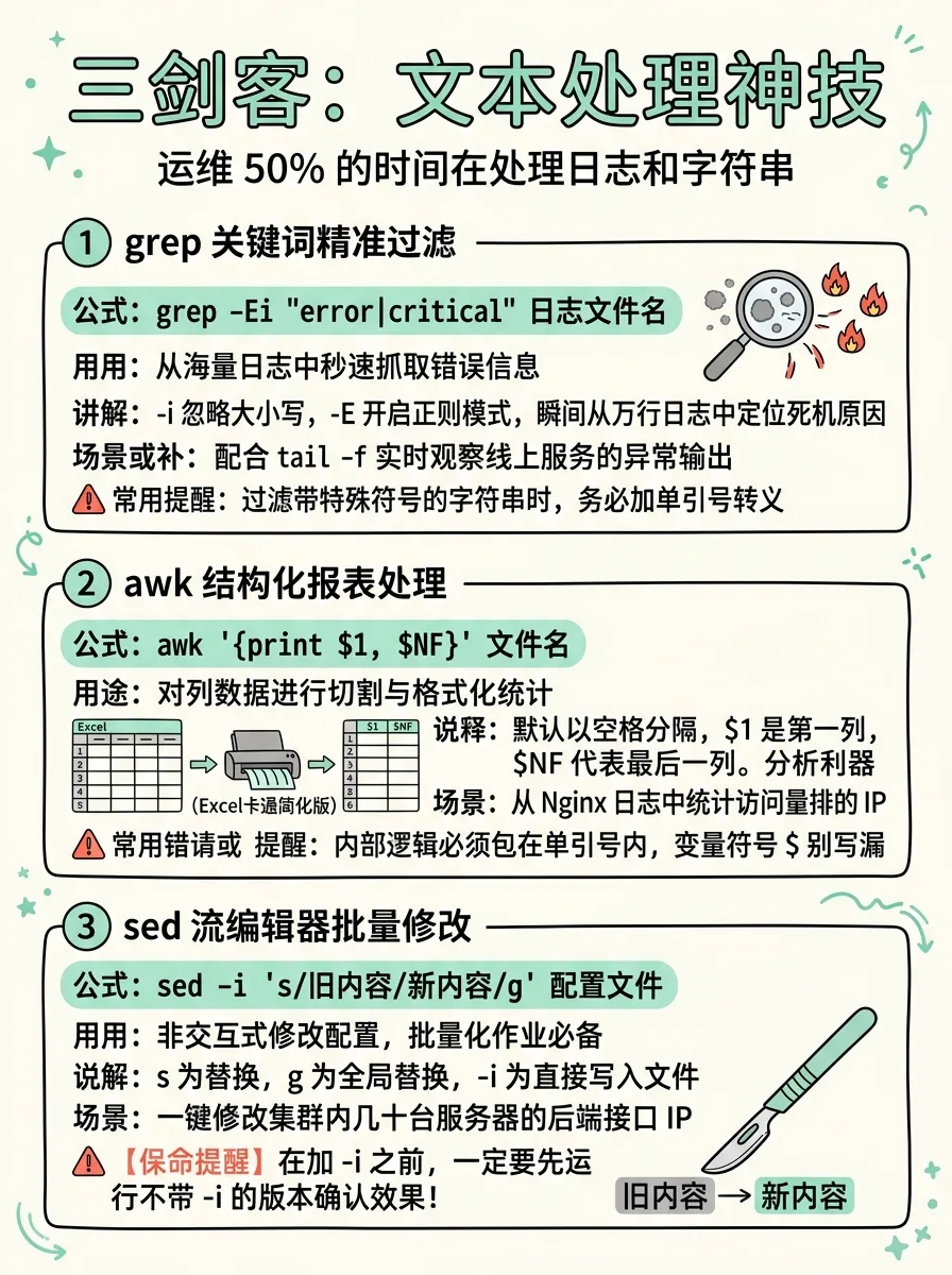 | 文本处理 | cat、less、head、tail、grep、sed、awk、vim | |