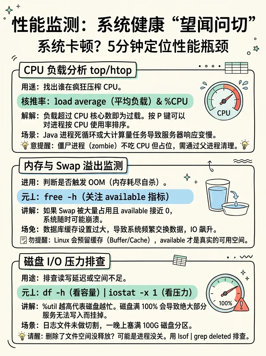 | 系统监控 | free(内存)、df/du(磁盘)、uptime(负载)、iostat(IO)、netstat/ss(网络) | |