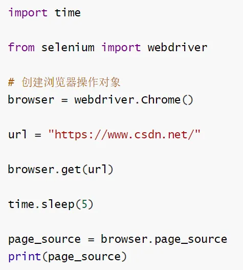 导入selenium的webdriver模块和time模块,使用time.sleep(5)设置 5 秒固定延时,等待 CSDN 首页(JS 动态渲染页面)完全加载,避免因页面未加载完成导致获取的源码不完整。