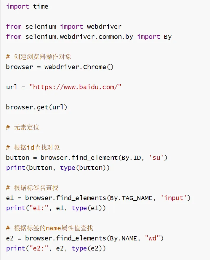 使用 find_element(By.ID, 值) 按照 ID 选择器定位页面元素。