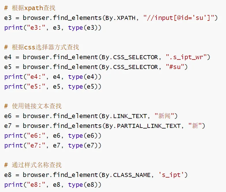 多元素定位方法:使用find_elements()方法定位页面中所有匹配条件的元素,返回元素列表。