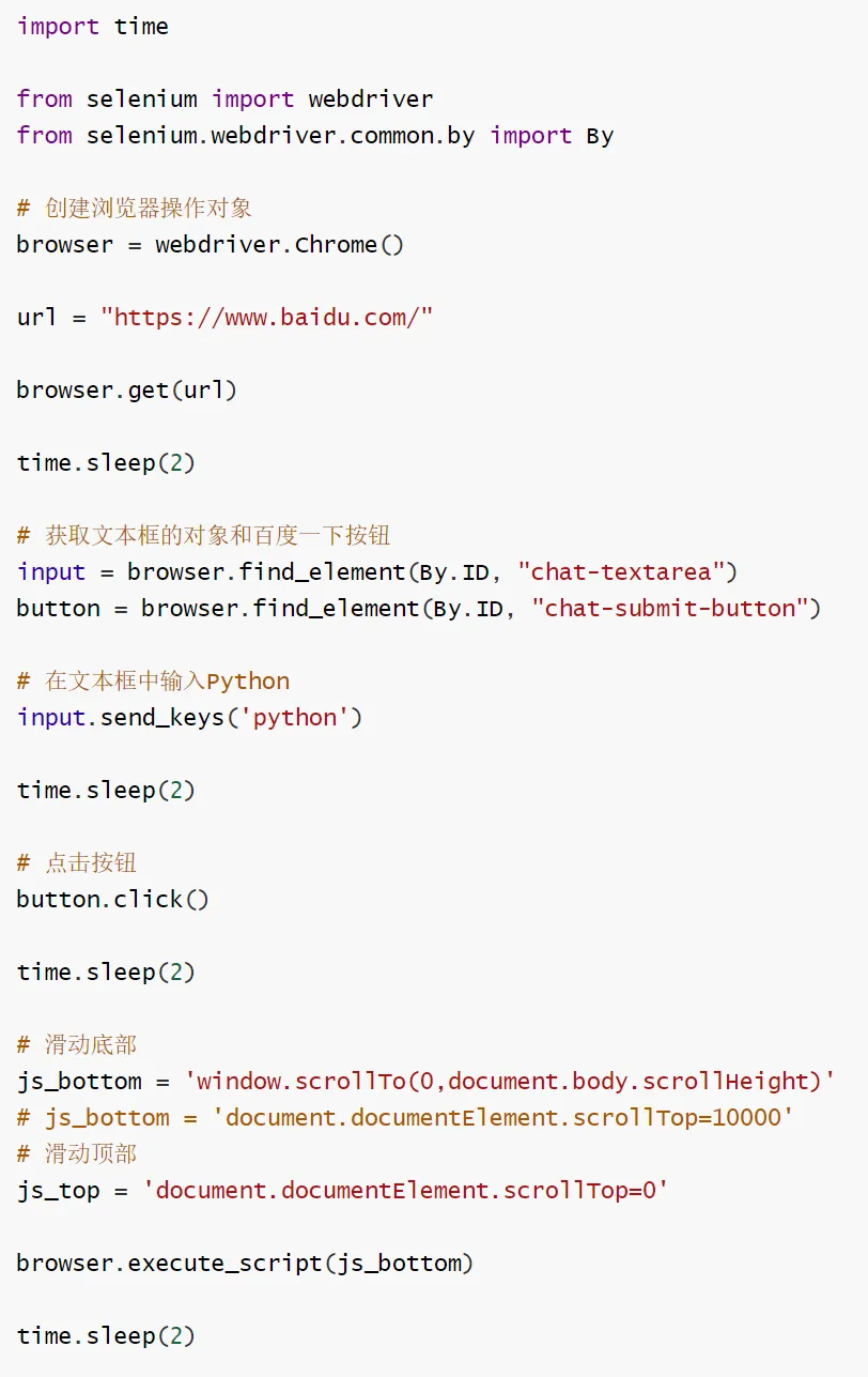 执行 JavaScript 代码:调用execute_script()方法执行 JS 语句实现页面滚动,包括滚动到底部(window.scrollTo/document.documentElement.scrollTop)和滚动到顶部(document.documentElement.scrollTop=0)。