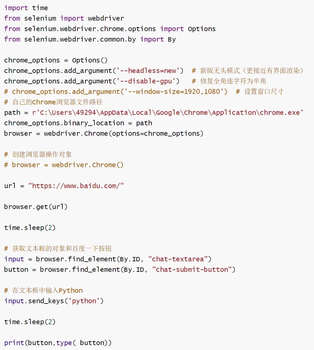 使用 selenium 库进行浏览器自动化操作,通过 webdriver.Chrome() 创建 Chrome 浏览器对象。