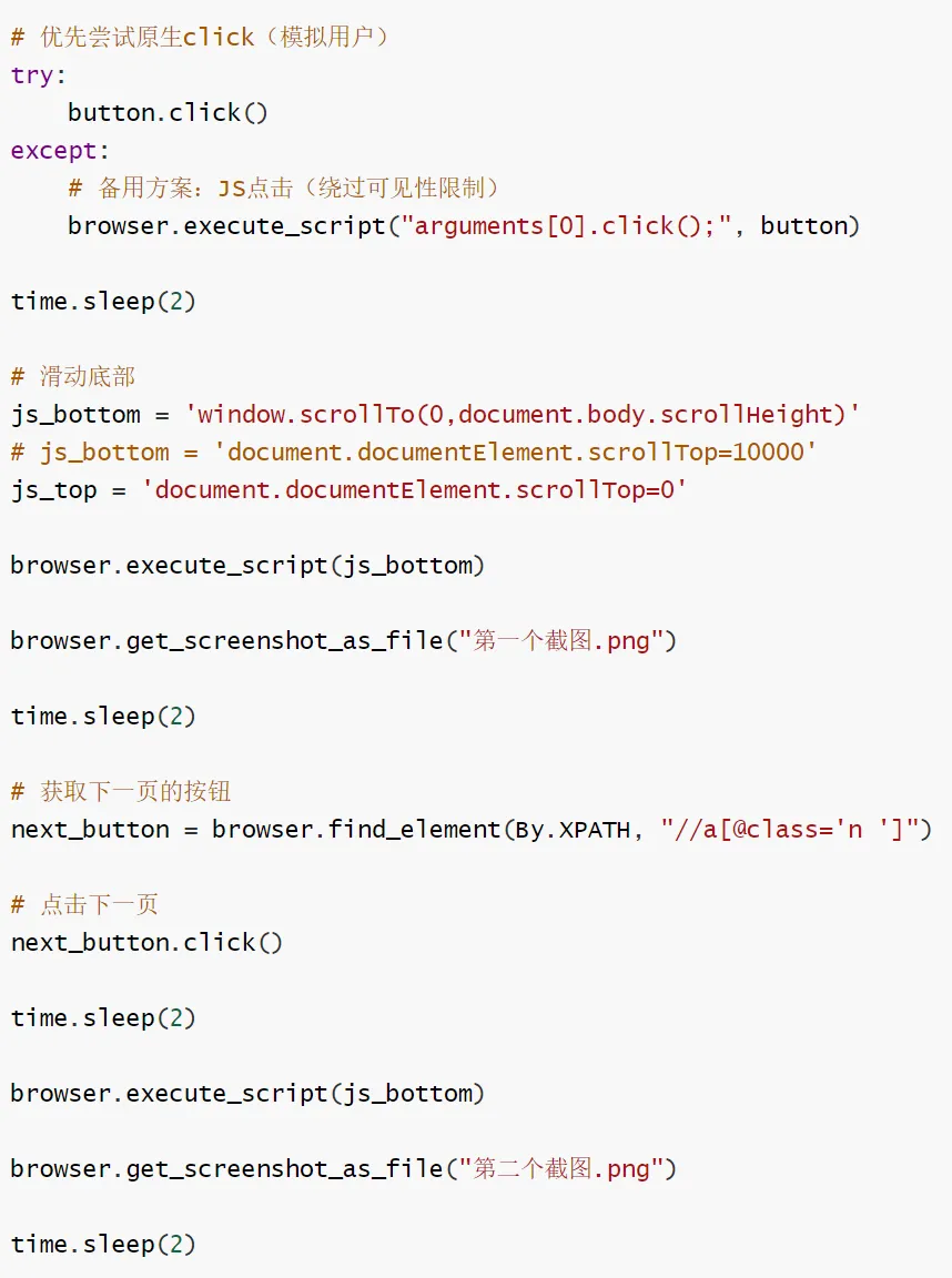元素点击的容错处理:优先尝试原生click()方法模拟真实用户点击元素,捕获点击异常后,采用执行 JavaScript 代码的备用方案触发元素点击,绕过元素可见性、可交互性等限制。