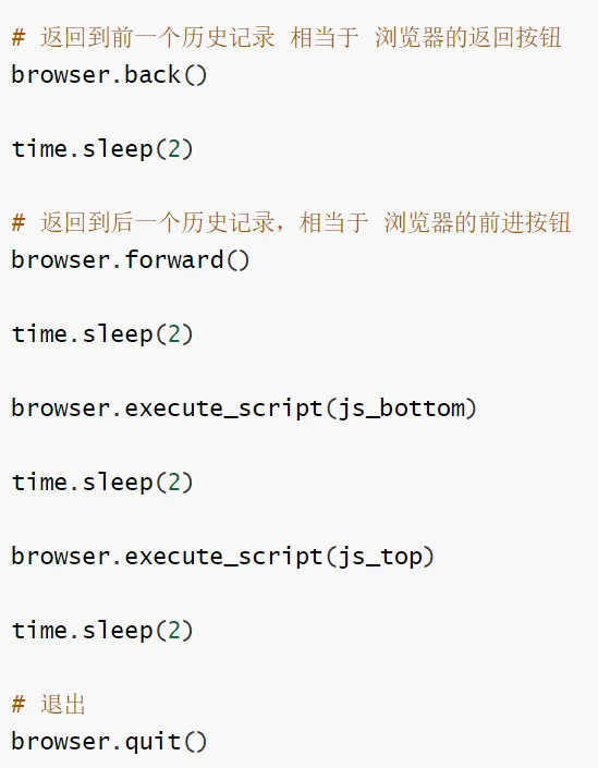 浏览器历史记录控制:使用back()方法模拟浏览器返回上一页操作,使用forward()方法模拟浏览器前进下一页操作。