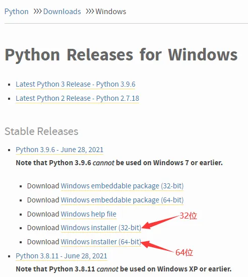 (3)在Python下载列表页面中,列出了Python提供的各个版本的下载链接。读者可以根据需要下载。在此以版本3.9.6为例,由于笔者的操作系统为Windows 64位,所以单击“Windows installer(64-bit)”超链接,下载适用于Windows 64位操作系统的离线安装包。