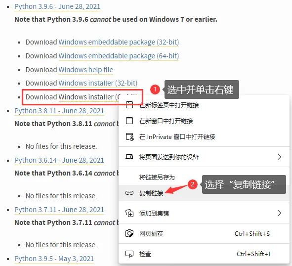 多学两招:由于Python官网是一个国外的网站,所以在下载Python时,下载速度会非常慢,这里推荐使用专用的下载工具进行下载(比如国内常用的迅雷软件),下载过程为:在要下载超链接上单击鼠标右键,在弹出的快捷菜单中选择“复制链接”(有的浏览器可能为“复制链接地址”),如图3所示,然后打开下载软件,新建下载任务,将复制的链接地址粘贴进去进行下载。