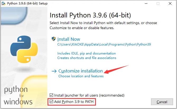 (1)双击下载后得到的安装文件python-3.9.6-amd64.exe,将显示安装向导对话框,选中“Add Python 3.9 to PATH”复选框,表示将自动配置环境变量。如图4所示。