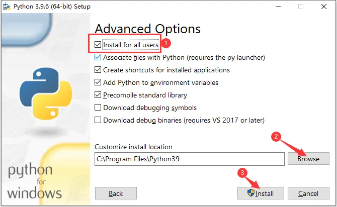 (3)单击Next按钮,打开高级选项对话框,在该对话框中,除了默认设置外,还需要手动选中“Install for all users”复选框(表示使用这台计算机的所有用户都可以使用),然后单击“Browse”按钮设置Python的安装路径,如图6所示。