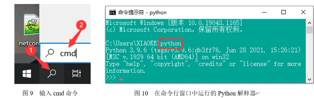 Python安装完成后,需要测试Python是否成功安装。例如,在Windows 10系统中检测Python是否成功安装,可以单击开始菜单右侧的“在这里输入你要搜索的内容”文本框,在其中输入cmd命令,如图9所示,按下键,启动命令行窗口;在当前的命令提示符后面输入“python”,并按下键,如果出现如图10所示的信息,则说明Python安装成功,同时系统进入交互式Python解释器中。