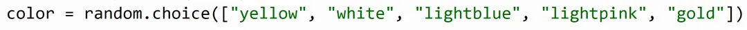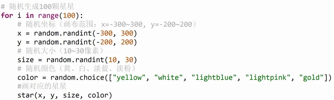 choice函数可以从给定的数据中随机选择一个,在这里我们用["yellow", "white", "lightblue", "lightpink", "gold"]的这种写法存储了5种不同的颜色。[]代表列表的意思,和之前的scratch阶段我们学到的列表是一样的道理,列表可以存储多个数据,所以我们用列表来存储我们的多种颜色,然后放到choice()函数里,就可以在我们指定的颜色中进行随机了。当然,我们可以自己再添加新的颜色,在gold后面添加就行,注意用逗号间隔,并且颜色的单词要用引号包起来。4. 绘画最后,拿着这些随机出来的数据,调用咱们的星星函数,海龟就会到达我们指定的x、y的位置,画指定大小、指定颜色的圆点: