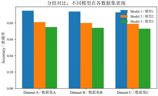 import osimport numpy as npimport matplotlib as mplimport matplotlib.pyplot as pltfrom matplotlib import font_manager as fmfrom matplotlib.ticker import MaxNLocator, FormatStrFormatter# == 字体设置 ==win_fonts = r"C:\Windows\Fonts"for p in [os.path.join(win_fonts, "times.ttf"),os.path.join(win_fonts, "timesbd.ttf"),os.path.join(win_fonts, "timesi.ttf"),os.path.join(win_fonts, "simsun.ttc"),]:if os.path.exists(p):try:fm.fontManager.addfont(p)except Exception:passmpl.rcParams["font.family"] = ["Times New Roman", "SimSun"]mpl.rcParams["axes.unicode_minus"] = FalseOUT_DIR = r"D:\py_figs_grouped"os.makedirs(OUT_DIR, exist_ok=True)# == 示例数据 ==categories = ["Dataset A / 数据集A","Dataset B / 数据集B","Dataset C / 数据集C"]model1 = np.array([0.91, 0.87, 0.89])model2 = np.array([0.88, 0.85, 0.86])model3 = np.array([0.84, 0.83, 0.82])x = np.arange(len(categories))width = 0.25fig, ax = plt.subplots(figsize=(7.2, 4.2))ax.bar(x - width, model1, width, label="Model 1 / 模型1")ax.bar(x, model2, width, label="Model 2 / 模型2")ax.bar(x + width, model3, width, label="Model 3 / 模型3")ax.set_xticks(x)ax.set_xticklabels(categories, fontsize=11)ax.set_ylabel("Accuracy / 准确率", fontsize=12)ax.set_title("分组对比:不同模型在各数据集表现", fontsize=14)ax.set_ylim(bottom=0)ax.yaxis.set_major_locator(MaxNLocator(nbins=6))ax.yaxis.set_major_formatter(FormatStrFormatter("%.2f"))ax.legend(frameon=False)out_path = os.path.join(OUT_DIR, "grouped_bar_basic.jpg")fig.savefig(out_path, dpi=300, bbox_inches="tight", pad_inches=0.05)plt.close(fig)print("Saved:", out_path)