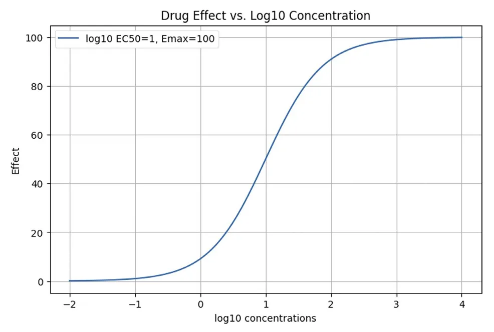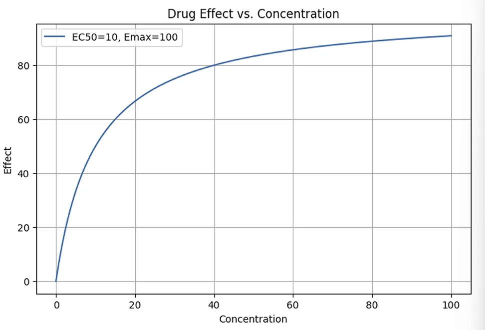 PD 建模有助于理解剂量–效应关系,在最大化药物疗效的同时最小化副作用。本节将介绍剂量–效应曲线、EC₅₀、Eₘₐₓ、希尔系数等概念,并介绍如何使用 Python 实现药效动力学模型,模拟与分析这些关系。