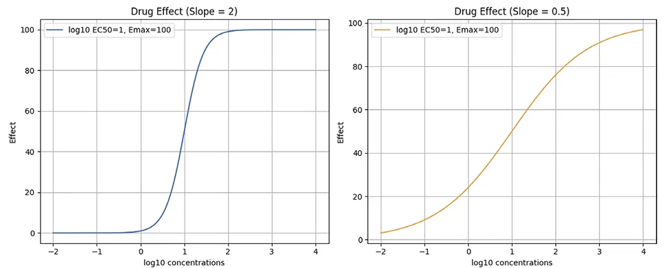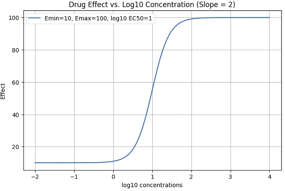 log₁₀(EC₅₀) = 1,对应线性 EC₅₀ = 10,希尔斜率 = 2,呈现陡峭的 S 形转变。