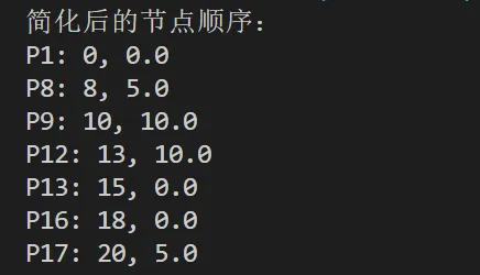 # 输出结果 print("简化后的节点顺序:") for i in range(len(keeppts)): if keeppts[i]: print(f"P{i+1}: {data.iloc[i, 0]}, {data.iloc[i, 1]}")elif len(data) == 2: print("就 2 个点,不用简化啦!")else: print("坐标点个数不对!")