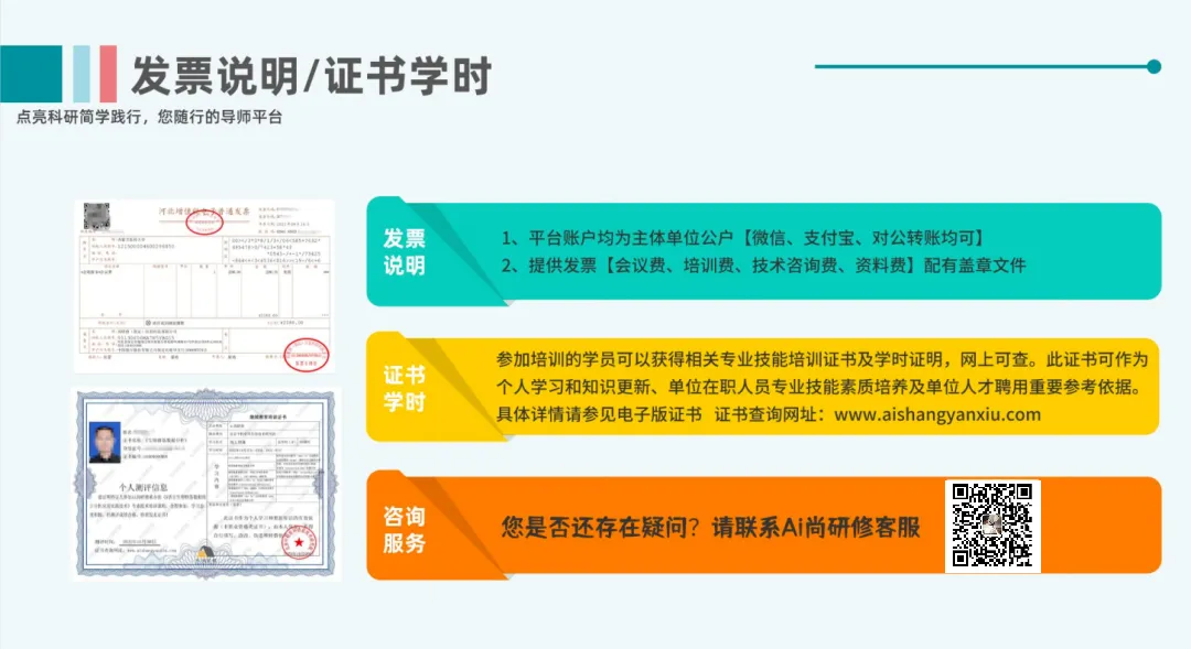 1:报名人员转发海报,推荐好课程,集赞20枚,可获得100元现金回馈。发票类别:培训费、会议费、资料费、技术咨询费等,配有盖章文件等,用于参会人员报销使用