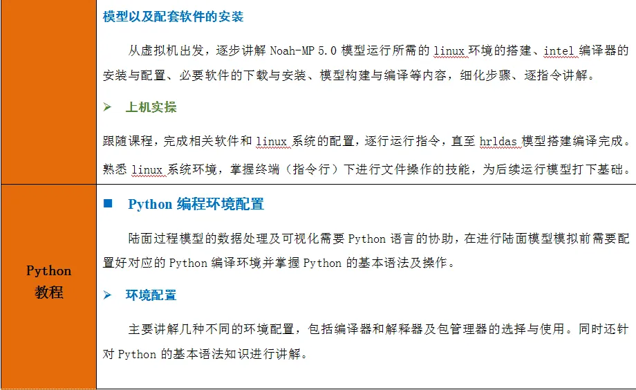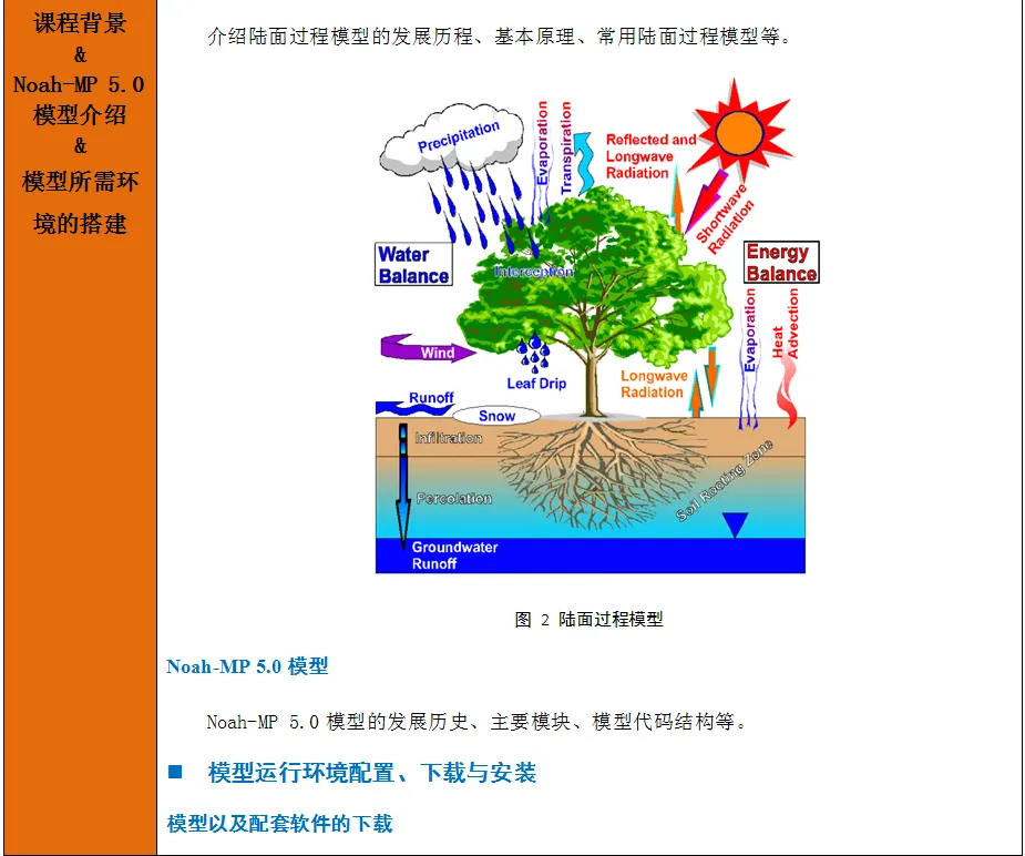 本课程目的使参会学员熟悉陆表过程的主要研究内容以及陆面模型在生态水文研究中的地位和作用;深入理解Noah-MP 5.0模型的原理,掌握Noah-MP模型(2023年最新发布的5.0版本)所需的系统环境与编译环境的搭建方法及模型实践运行,熟悉linux系统操作环境及Python编程;掌握利用Python语言进行站点与区域数据的处理、单站和区域的模拟、模拟结果的输出和后续分析及可视化等方法。
