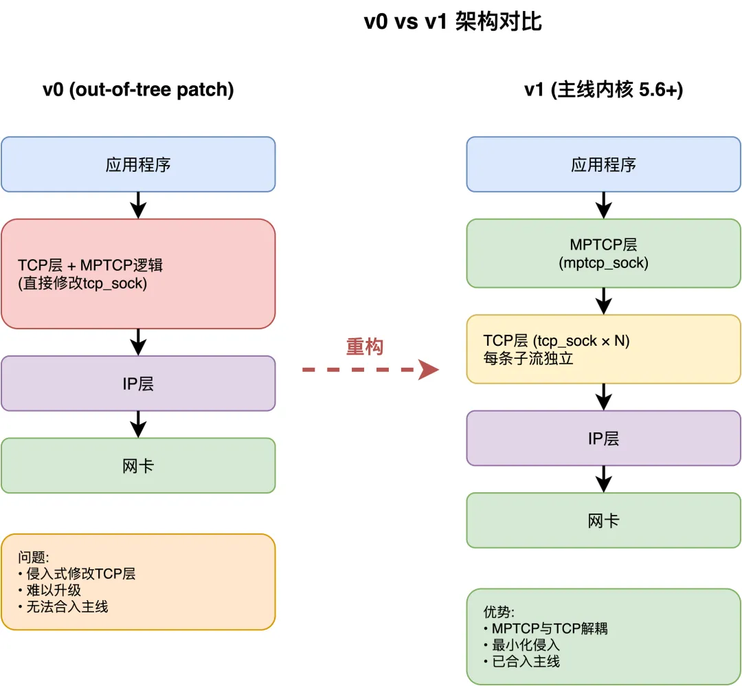 如果你在 2020 年之前接触过 MPTCP,那你看到的是 v0(out-of-tree patch)。如果你现在用 Linux 5.6+ 内核,那你用的是 v1(主线内核)。两者的架构完全不同。