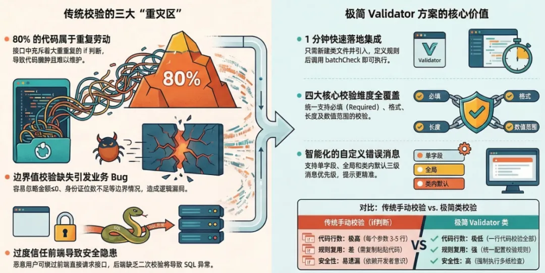 更头疼的是,冗余的校验代码占了接口代码的一半,后期修改时,要逐个接口调整,效率极低。今天分享一个 PHP 数据校验极简方案,无需任何第三方扩展,1个极简校验类,一行代码实现参数校验,自动收集错误提示,少写80%冗余代码,彻底杜绝非法请求和业务bug。