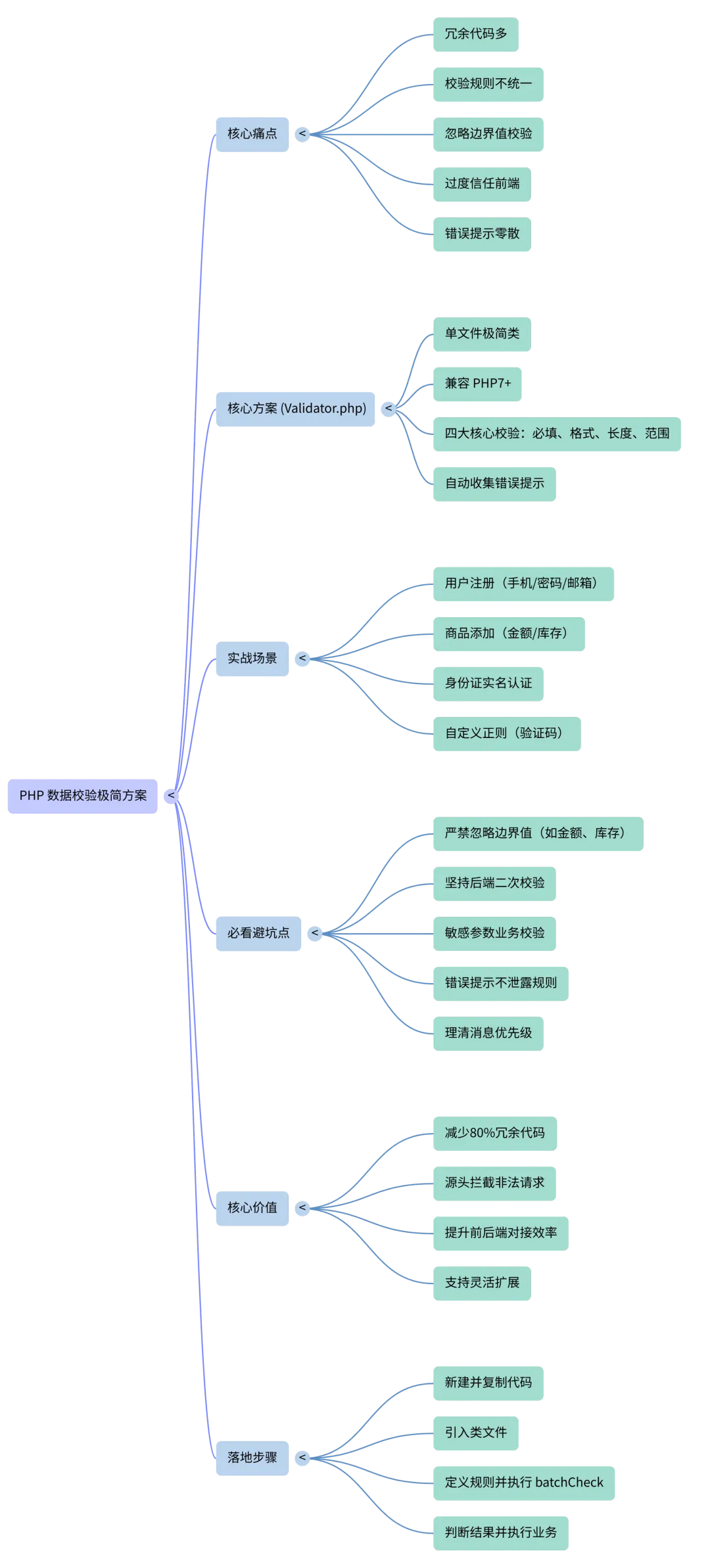 PHP数据校验,核心不是“写得多复杂”,而是“简单、高效、不遗漏”。这个极简校验类,无需第三方扩展,直接复制可用,覆盖中小项目90%的校验场景,既能少写冗余代码,又能杜绝非法请求,新手也能快速上手。