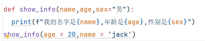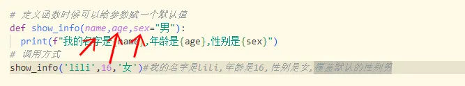 # 定义函数时候可以给参数赋一个默认值def show_info(name,age,sex="男"): print(f"我的名字是{name},年龄是{age},性别是{sex}")# 调用方式show_info('jack',20)# 我的名字是jack,年龄是20,没传年龄默认性别是男show_info('lili',16,'女')#我的名字是lili,年龄是16,性别是女,覆盖默认的性别男