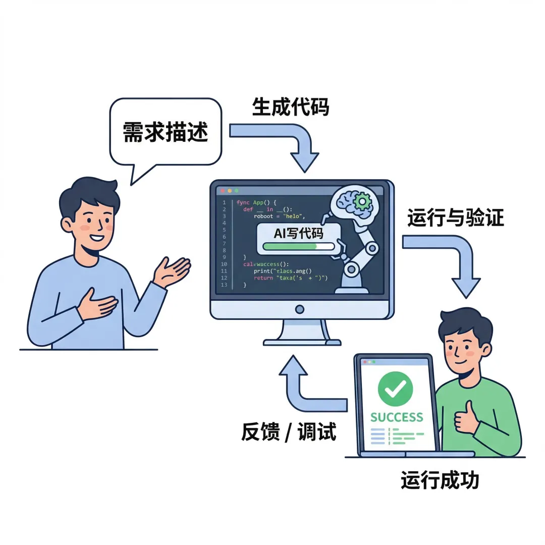 简单说就是:你负责描述需求,AI负责写代码,出了问题你把报错信息反馈给AI,它来修正,如此循环,直到跑通为止。