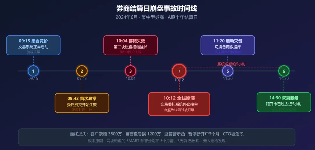 5个月前,第一块盘的SMART报警出现了。如果有人在那个周的巡检里看到这个数字,提了换盘申请,跟进到换盘完成,后面的一切都不会发生。3800万的赔偿不会有,监管警示函不会有,CTO也不用走人。