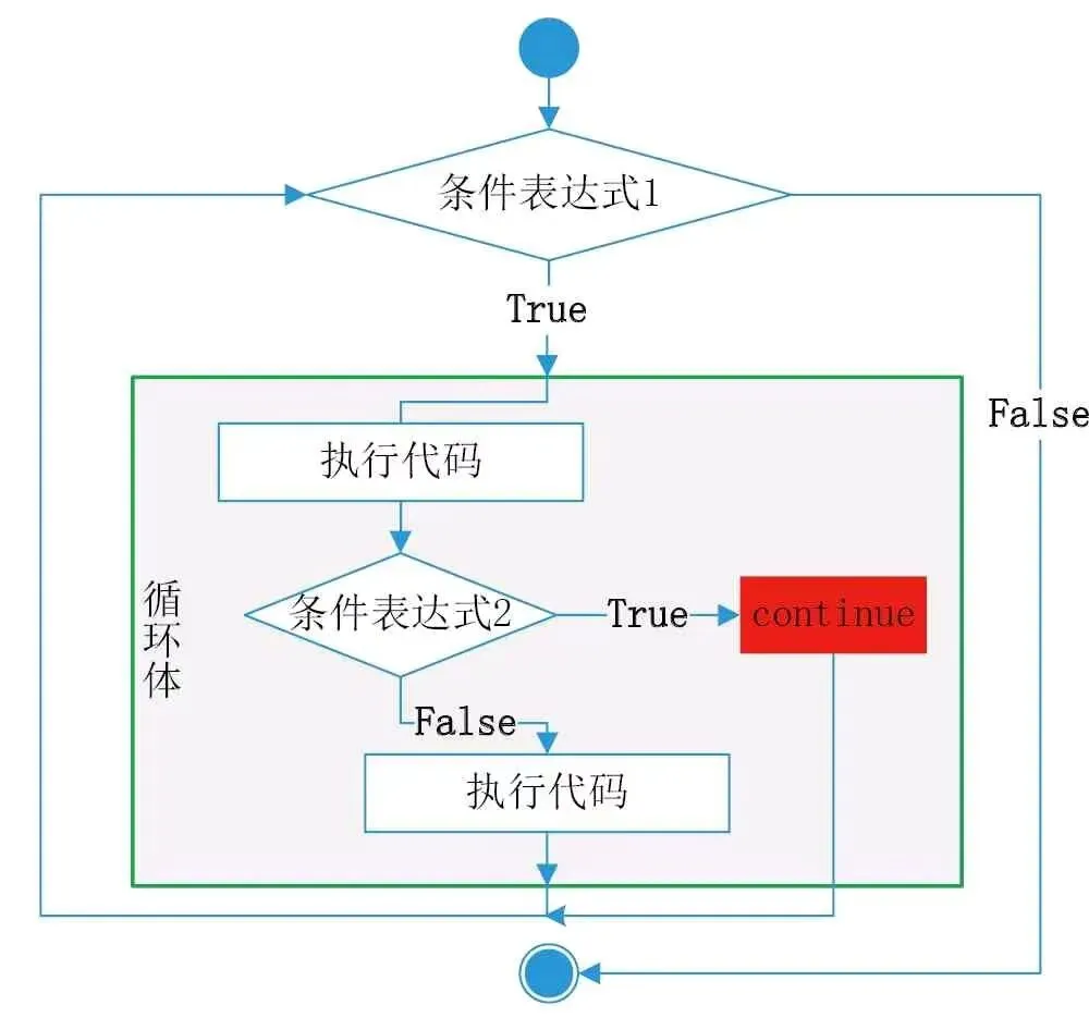 1.使用continue语句直接跳到循环的下一次迭代。在while语句中使用continue语句流程图: