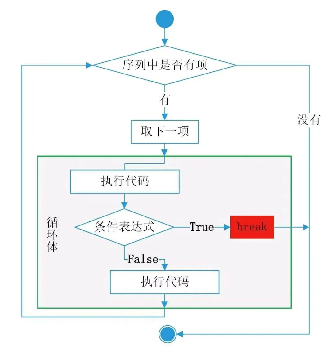 2.使用break完全中止循环。在for语句中使用break语句流程图: