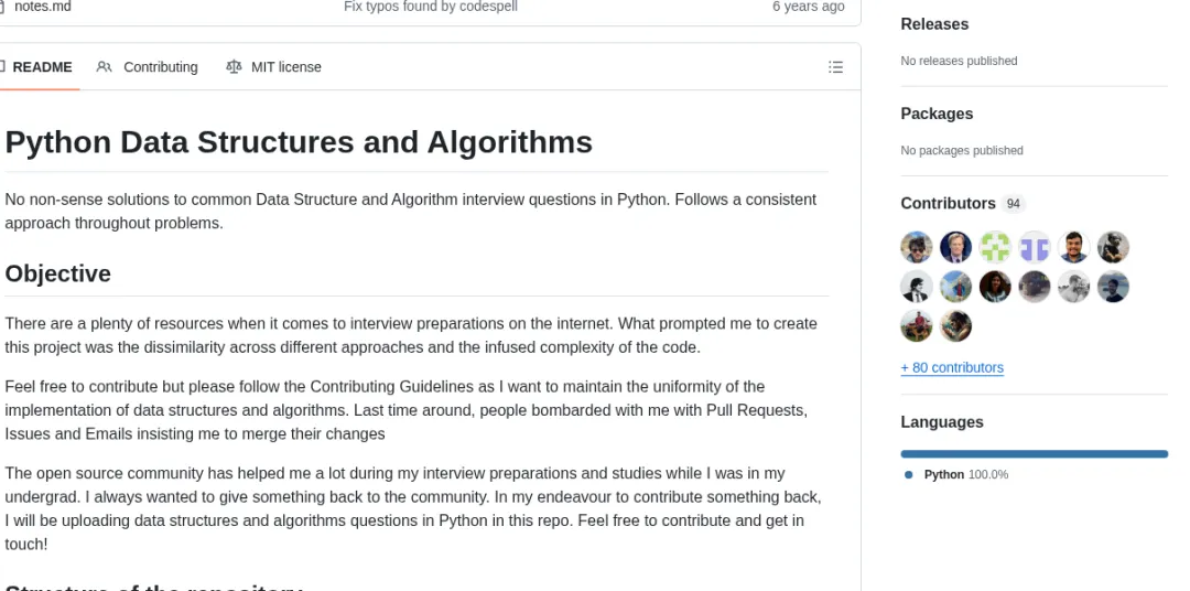 它收录了常见数据结构与算法面试题的纯 Python 实现,涵盖数组、链表、栈、二叉树、图、动态规划、贪心、字符串等分类,每道题风格统一、代码简洁。