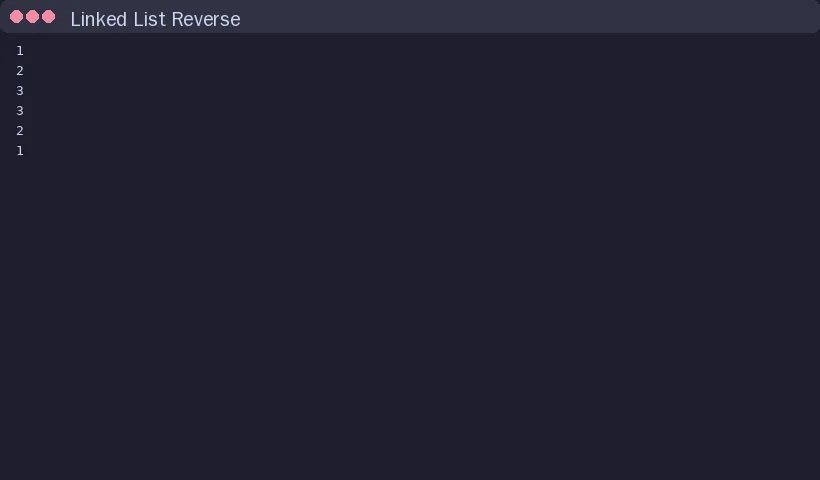 反转前输出 1→2→3,反转后输出 3→2→1。三指针法(prev、curr、next)是链表反转的标准做法,时间 O(n),空间 O(1)。面试高频题。