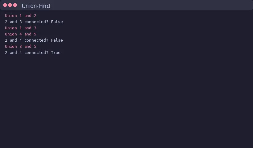 fromdata_structures.union_find.ufimportUnion_finduf=Union_find(6)uf.union(1,2)print('2 and 3 connected?',uf.find(2,3))uf.union(1,3)uf.union(4,5)print('2 and 4 connected?',uf.find(2,4))uf.union(3,5)print('2 and 4 connected?',uf.find(2,4))